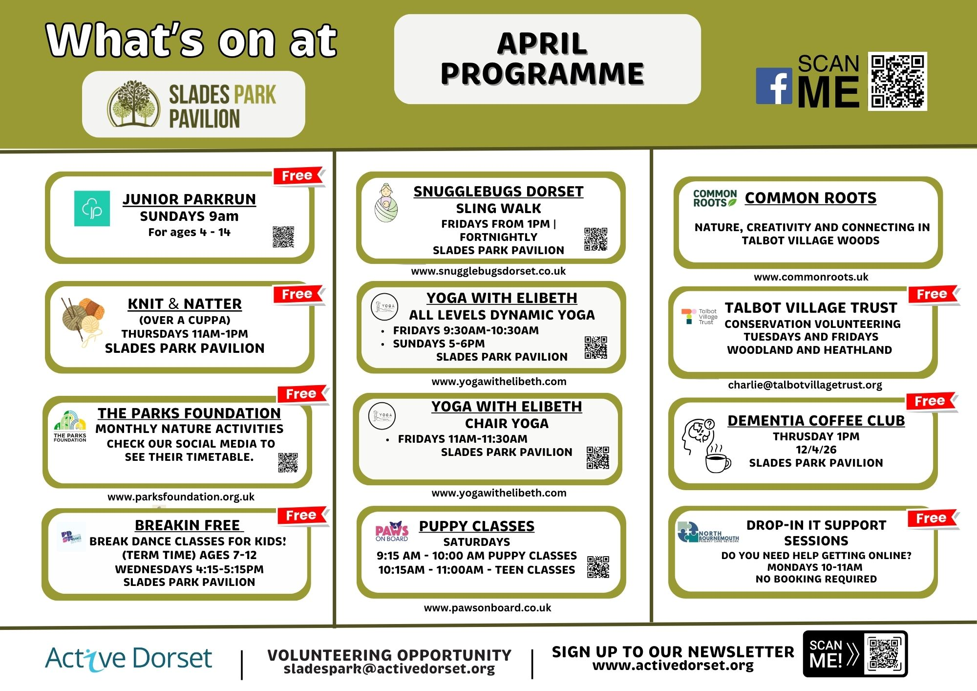 Slades Farm / Park always have a lot of events on, both at the Pavilion and the adjacent Community Centre.  The Parks Foundation, a charity who help support the wider set of parks in the BCP area also advertise events specific to Slades Farm (the link to the Parks Foundation site can always be found on our directory page, but there is a link lower down this page).  Please take a look at each of the links below to see if there are any events that you may be interested in.