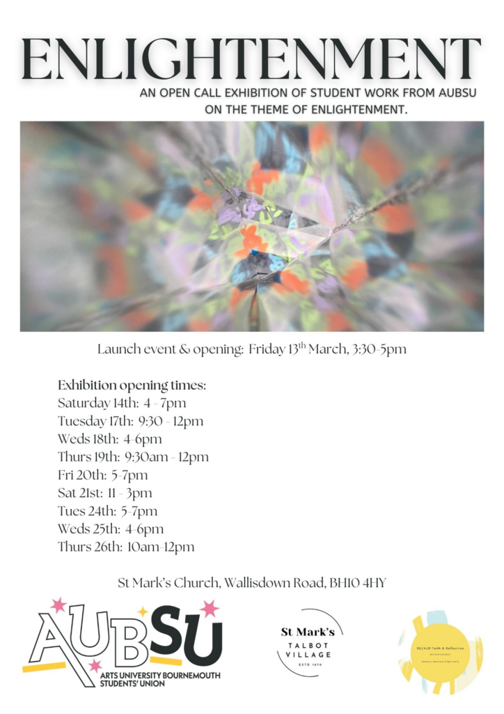 The theme is ‘enlightenment’ and is a showcase of work provided by the Arts University of Bournemouth.